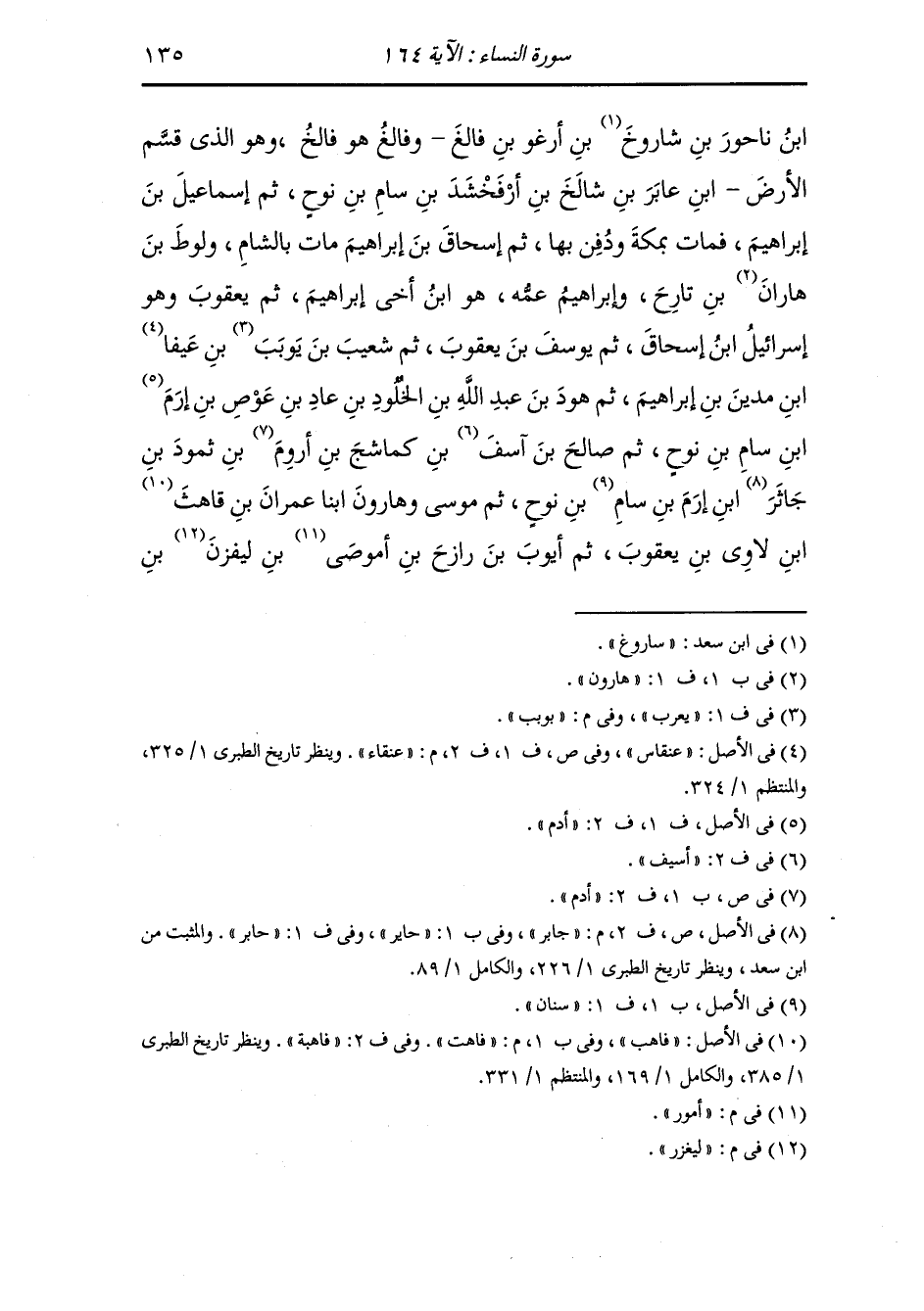 وأخرج ابن سعد والزبير بن بكار في الموفقيات ، وَابن عساكر عن الكلبي قال : أول نبي بعثه الله في الأرض إدريس وهو أخنوخ بن يرد وهو يارد ابن مهلاييل بن قينان بن أنوش بن شيث بن آدم ثم انقطعت الرسل حتى بعث نوح بن لمك بن متوشلخ بن أخنوخ بن يارد وقد كان سام بن نوح نبيا ثم انقطعت الرسل حتى بعث الله إبراهيم نبيا وهو إبراهيم بن تارح وتارح هو آزر