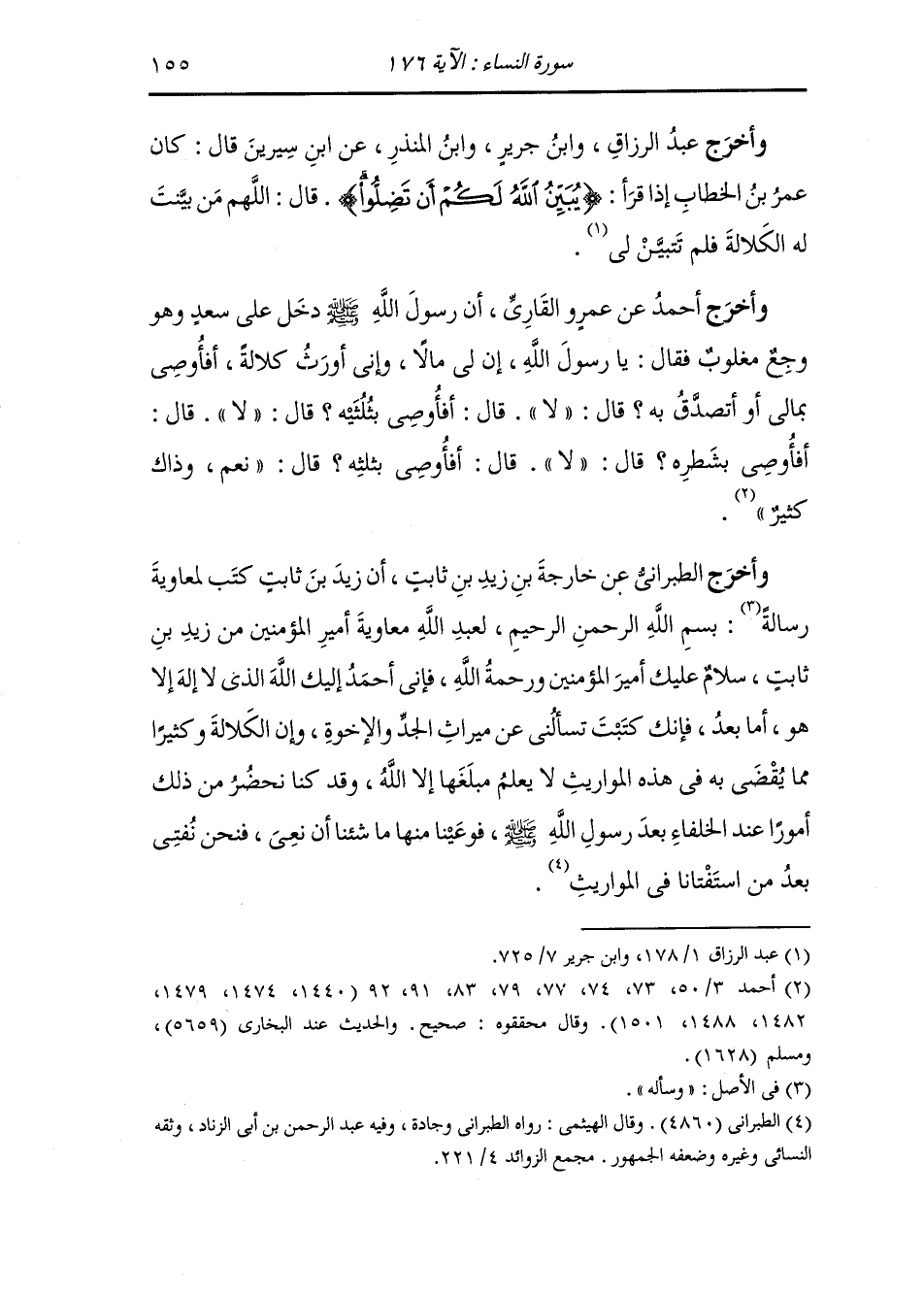 وأخرج ابن جرير ، وعَبد بن حُمَيد والبيهقي في "سُنَنِه" عن قتادة قال : ذكر لنا أن أبا بكر الصديق قال في خطبته : ألا إن الآية التي أنزلت في سورة النساء في شأن الفرائض أنزلها الله في الولد والوالد والآية الثانية أنزلها في الزوج والزوجة والأخوة من الأم والآية التي ختم بها سورة النساء أنزلها في الأخوة والأخوات من الأب والأم والآية التي ختم بها سورة الأنفال أنزلها في أولي الأرحام بعضهم أولى ببعض في كتاب الله مما جرت به الرحم من العصبة.