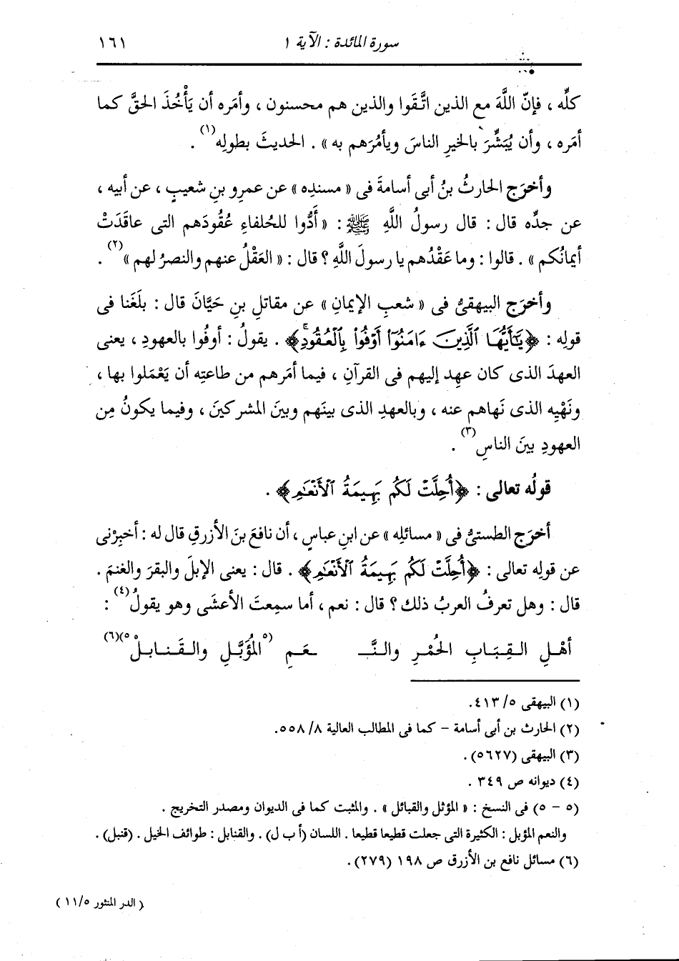 وأخرج ابن جرير ، وَابن المنذر عن قتادة في قوله {أوفوا بالعقود} أي بعقد الجاهلية ذكر لنا ان نبي الله صلى الله عليه وسلم كان يقول أوفوا بعقد الجاهلية ولاتحدثوا عقدا في الإسلام.