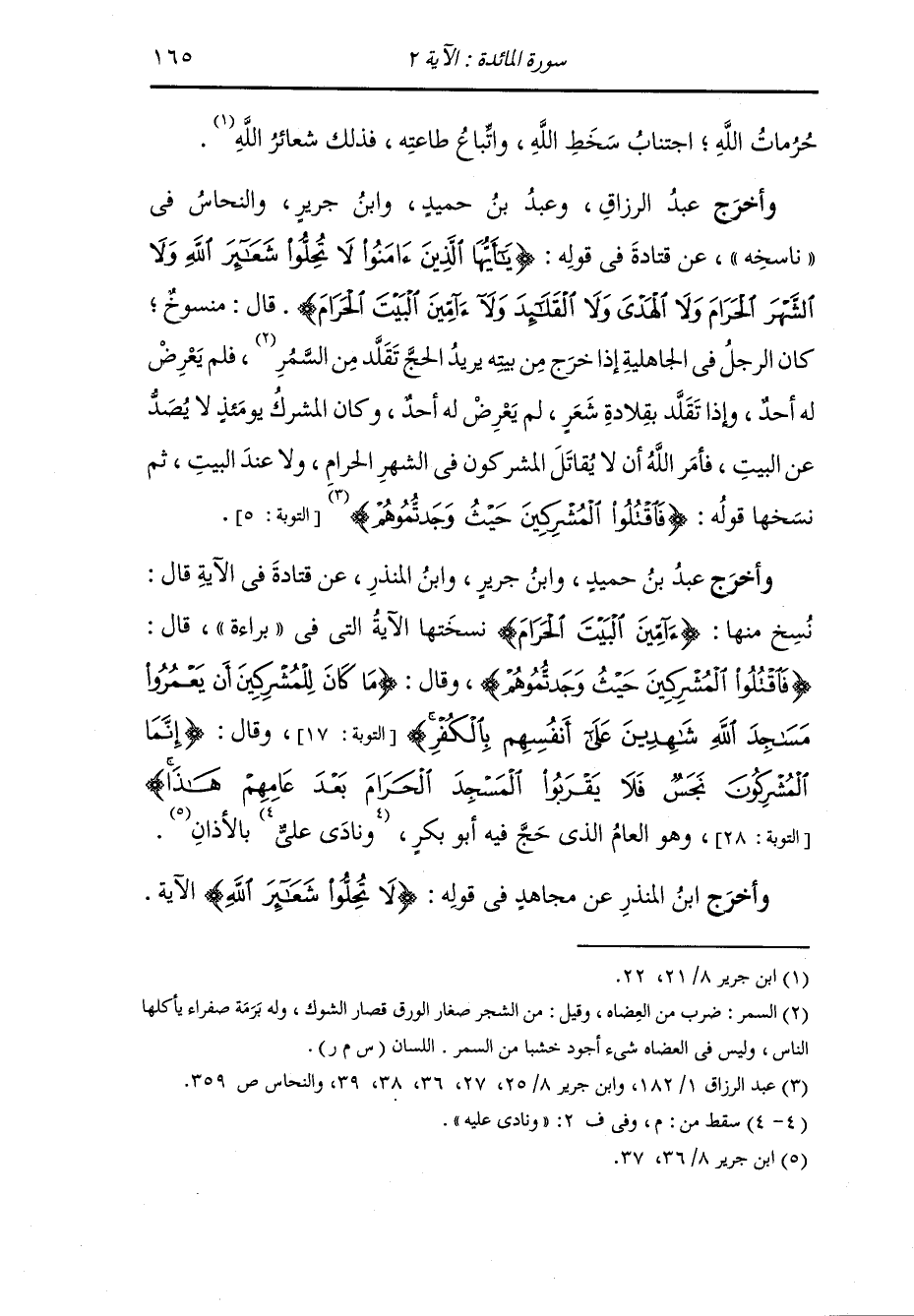 وأخرج ابن جرير عن ابن عباس في قوله {لا تحلوا شعائر الله} قال : مناسك الحج.