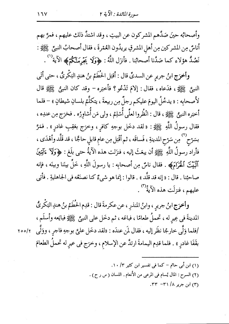 وأخرج عَبد بن حُمَيد عن مجاهد في قوله {لا تحلوا شعائر الله} قال : القلائد ، اللحاء في رقاب الناس والبهائم أمانا لهم والصفا والمروة والهدي والبدن كل هذا من شعائر الله قال أصحاب محمد صلى الله عليه وسلم هذا كله عمل أهل الجاهلية فعله واقامته فحرم الله ذلك كله بالاسلام إلا اللحاء القلائد ترك ذلك.