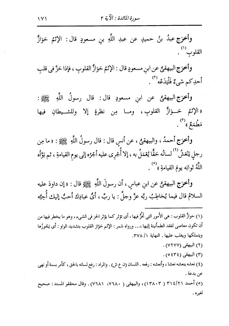 سألته عنه فقال لي ياوابصة أخبرك عما جئت تسأل عنه أم تسأل قلت : يا رسول الله أخبرني قال : جئت لتسأل عن البر والاثم ثم جمع أصابعه الثلاث فجعل ينكت بها في صدري ويقول : يا وابصة استفت قلبك استفت نفسك البر : مااطمأن اليه القلب واطمأنت اليه النفس والاثم : ماحاك في القلب وتردد في الصدر وان أفتاك الناس وأفتوك.