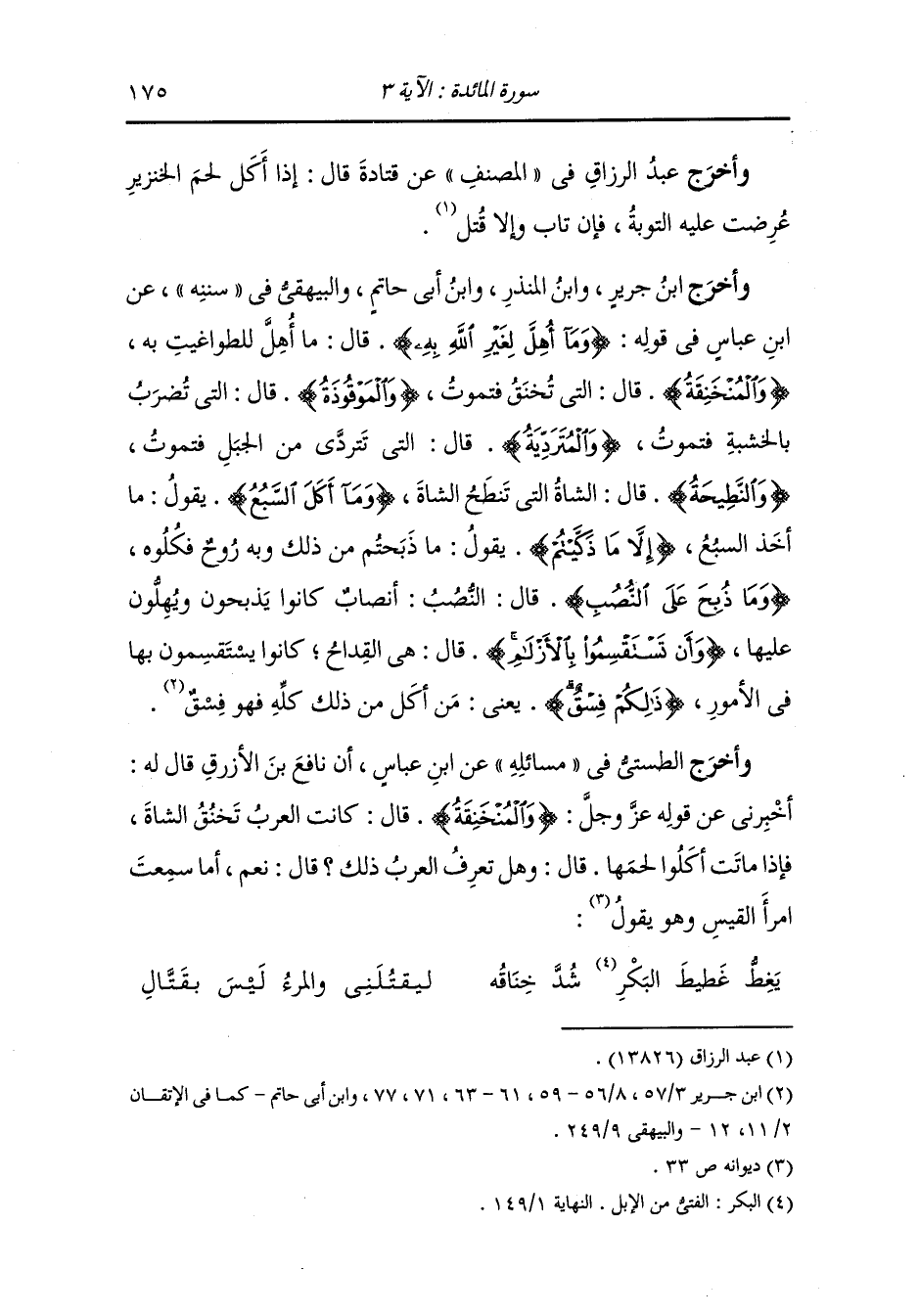 - قوله تعالى : حرمت عليكم الميتة والدم ولحم الخنزير وما أهل لغير الله به والمنخنقة والموقوذة والمتردية والنطيحة وما أكل السبع إلا ما ذكيتم وما ذبح على النصب وأن تستقسموا بالأزلام ذلكم فسق اليوم يئس الذين كفروا من دينكم فلا تخشوهم واخشون اليوم أكملت لكم دينكم وأتممت عليكم نعمتي ورضيت لكم الإسلام دينا فمن اضطر في مخمصة غير متجانف لإثم فإن الله غفور رحيم.