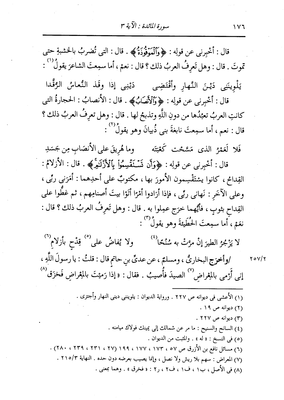 وأخرج الطستي في مسائله عن ابن عباس ان نافع بن الازرق قال له : أخبرني عن قوله تعالى {والمنخنقة} قال : كانت العرب تخنق الشاة فاذا ماتت اكلوا لحمها ، قال : وهل تعرف العرب ذلك قال : نعم أما سمعت امرى ء القيس وهو يقول : يغط غطيط البكر شد خناقه * ليقتلني والمرء ليس بقتال