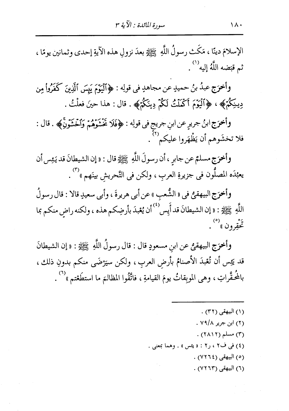 وأخرج البيهقي في شعب الايمان عن ابن عباس في قوله {اليوم يئس الذين كفروا من دينكم} يقول : يئس أهل مكة ان ترجعوا إلى دينهم عبادة الاوثان أبدا {فلا تخشوهم} في اتباع محمد {واخشوني} في عبادة الاوثان وتكذيب محمد فلما كان واقفا بعرفات نزل عليه جبريل وهو رافع يده والمسلمون يدعون الله {اليوم أكملت لكم دينكم} يقول : حلالكم وحرامكم فلم ينزل بعد هذا حلال ولاحرام {وأتممت عليكم نعمتي} قال : منتي فلم يحج معكم مشرك {ورضيت} يقول : واخترت {لكم