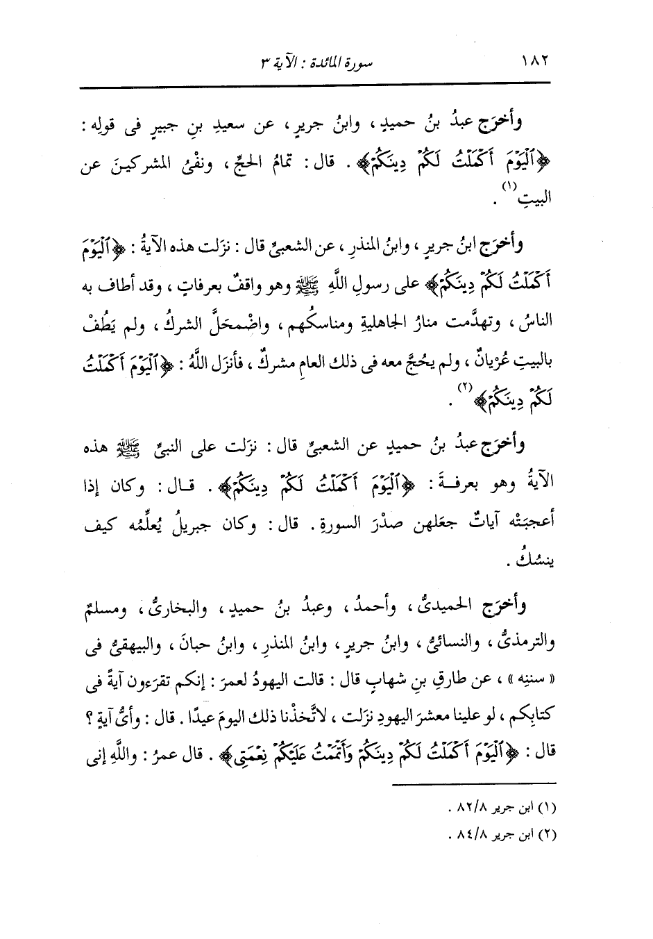 وَأخرَج عبد الرزاق ، وعَبد بن حُمَيد ، وَابن جَرِير عن قتادة في قوله {اليوم أكملت لكم دينكم} قال : أخلص الله لهم دينهم ونفى المشركين عن البيت قال : وبلغنا أنها انزلت يوم عرفة ووافقت يوم جمعة.