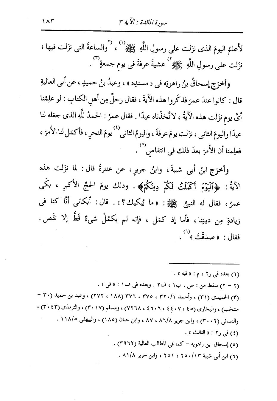 وأخرج الحميدي وأحمد ، وعَبد بن حُمَيد والبخاري ومسلم والترمذي والنسائي ، وَابن جَرِير ، وَابن المنذر ، وَابن حبان والبيهقي في "سُنَنِه" عن طارق بن شهاب قال قالت اليهود لعمر : انكم تقرأون آية في كتابكم لو علينا معشر اليهود نزلت لاتخذنا ذلك اليوم عيدا ، قال : وأي آية قالوا {اليوم أكملت لكم دينكم وأتممت عليكم نعمتي}