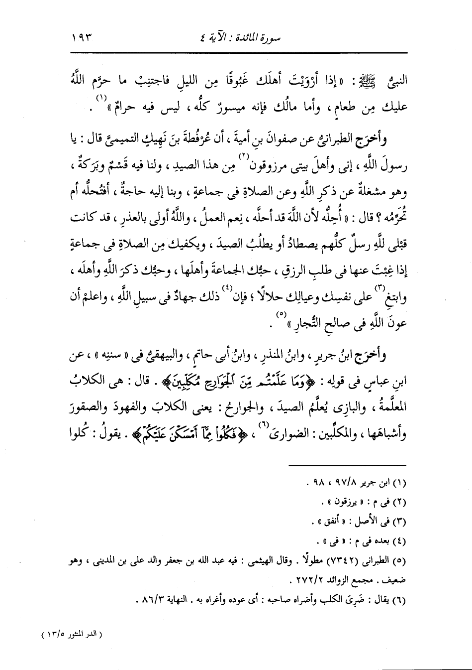 وأخرج عَبد بن حُمَيد ، وَابن جَرِير عن عامر ، ان عدي بن حاتم الطائي أتى رسول الله صلى الله عليه وسلم فسأله عن صيد الكلاب فلم يدر مايقول له حتى أنزل الله عليه هذه الآية في المائدة {تعلمونهن مما علمكم الله}.