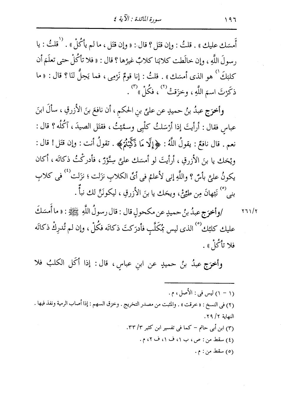 وأخرج ابن أبي حاتم عن عدي بن حاتم قال : قلت يارسول الله انا قوم نصيد بالكلاب والبزاة فما يحل لنا منها قال : يحل لكم {وما علمتم من الجوارح مكلبين تعلمونهن مما علمكم الله فكلوا مما أمسكن عليكم واذكروا اسم الله عليه} ثم قال : ما أرسلت من كلب وذكرت اسم الله فكل ما