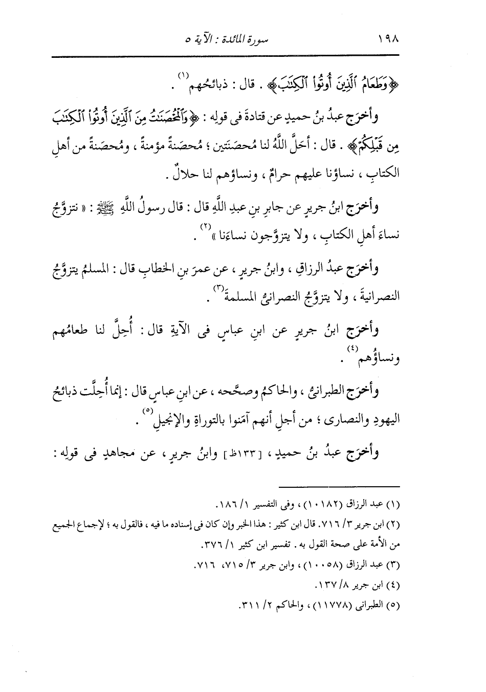 أَخْرَج ابن جرير ، وَابن المنذر ، وَابن أبي حاتم والنحاس والبيهقي في سنه عن ابن عباس في قوله {وطعام الذين أوتوا الكتاب} قال : ذبائحهم ، وفي قوله {والمحصنات من الذين أوتوا الكتاب من قبلكم} قال : حل لكم {إذا آتيتموهن أجورهن} يعني مهورهن {محصنين} يعني تنكحوهن بالمهر والبينة {غير مسافحين} غير معلنين بالزنا {ولا متخذات أخدان} يعني يسررن بالزنا.