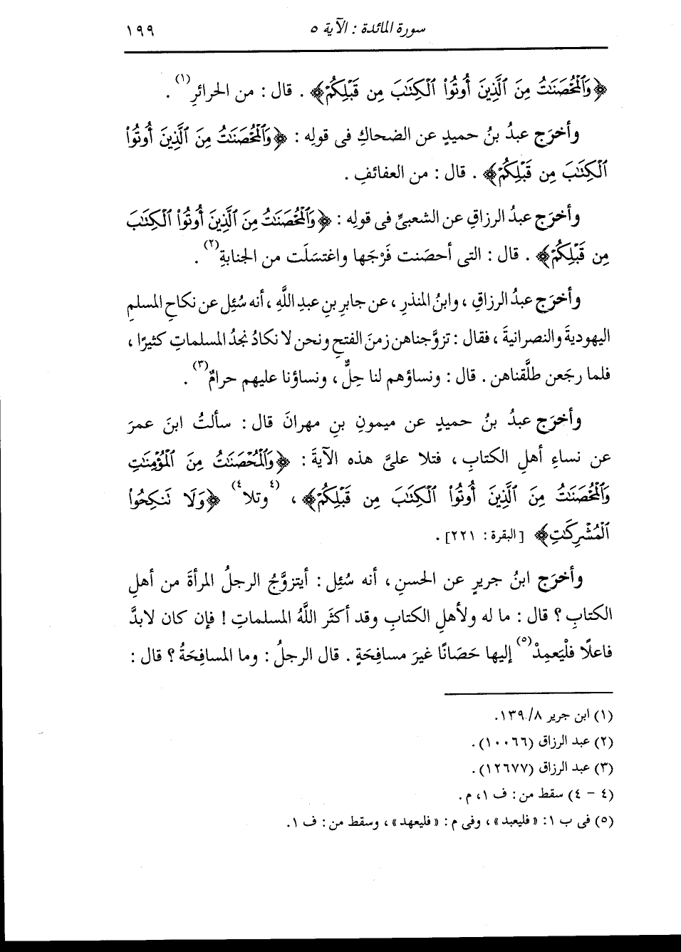 وأخرج عَبد بن حُمَيد عن قتادة في قوله {والمحصنات من المؤمنات والمحصنات من الذين أوتوا الكتاب من قبلكم} قال : أحل الله لنا محصنتين : محصنة مؤمنة ومحصنة من أهل الكتاب نساؤنا عليهم حرام ونساؤهم لنا حلال.