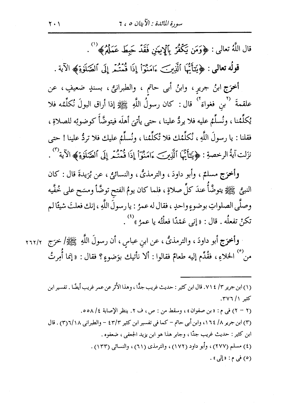 وأخرج عَبد بن حُمَيد عن قتادة في قوله {ولا متخذي أخدان} قال : ذو الخدن والخلية الواحدة ، قال : ذكر لنا ان رجالا قالوا : كيف نتزوج نساءهم وهم على دين ونحن على دين فانزل الله {ومن يكفر بالإيمان فقد حبط عمله} قال : لاوالله لايقبل الله عملا إلا بالايمان.