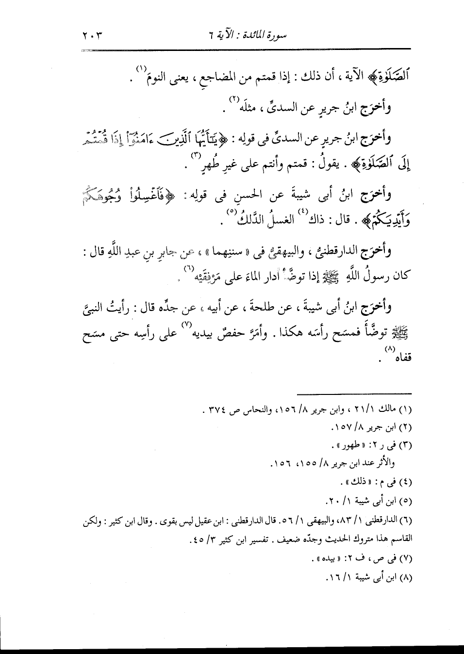 وأخرج ابن جرير والنحاس في ناسخه عن علي أنه كان يتوضأ عند كل صلاة ويقرأ {يا أيها الذين آمنوا إذا قمتم إلى الصلاة} الآية.
