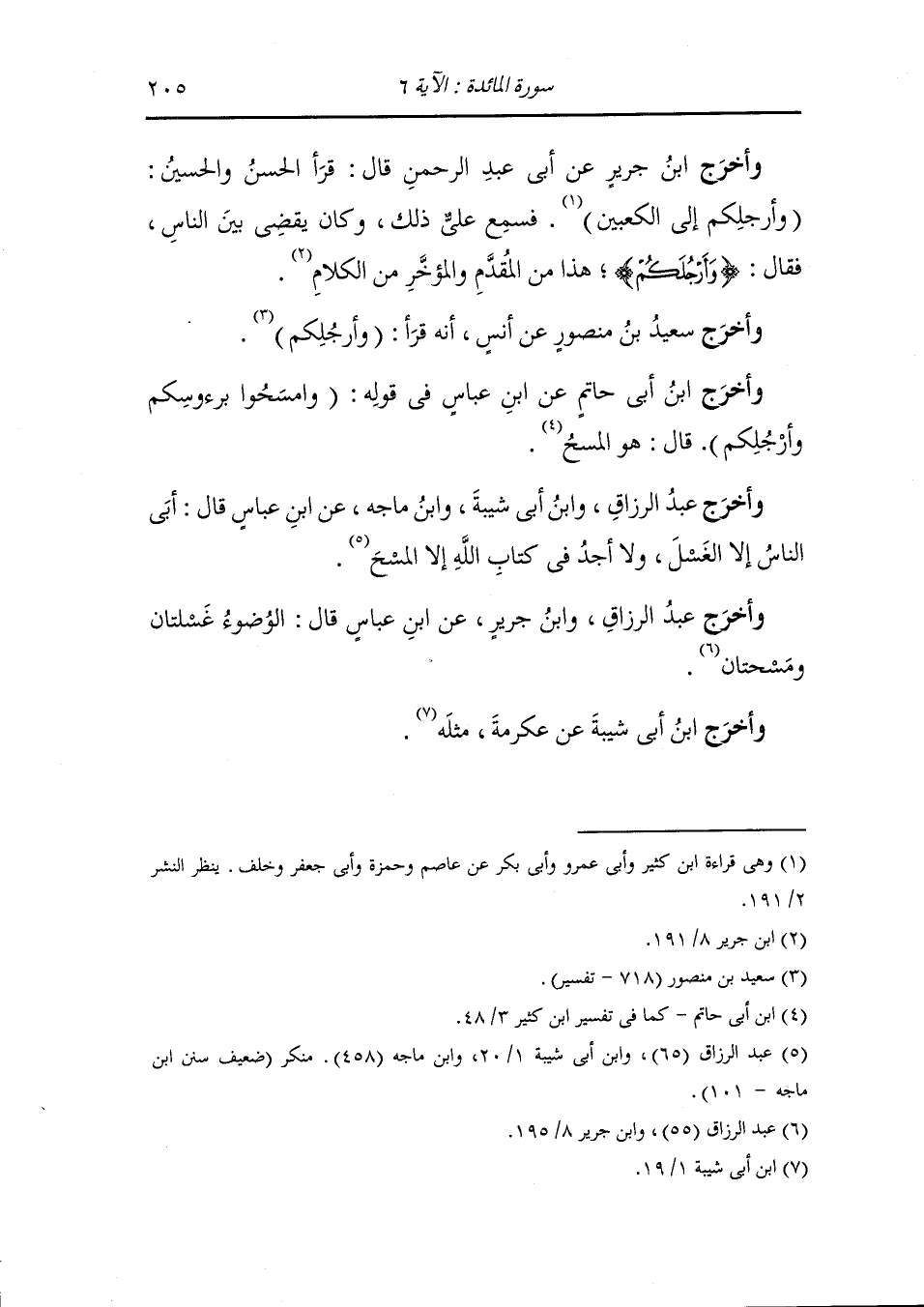 وأخرج عبد الرزاق والطبراني عن قتادة ان ابن مسعود قال : رجع قوله إلى غسل القدمين في قوله {وأرجلكم إلى الكعبين}