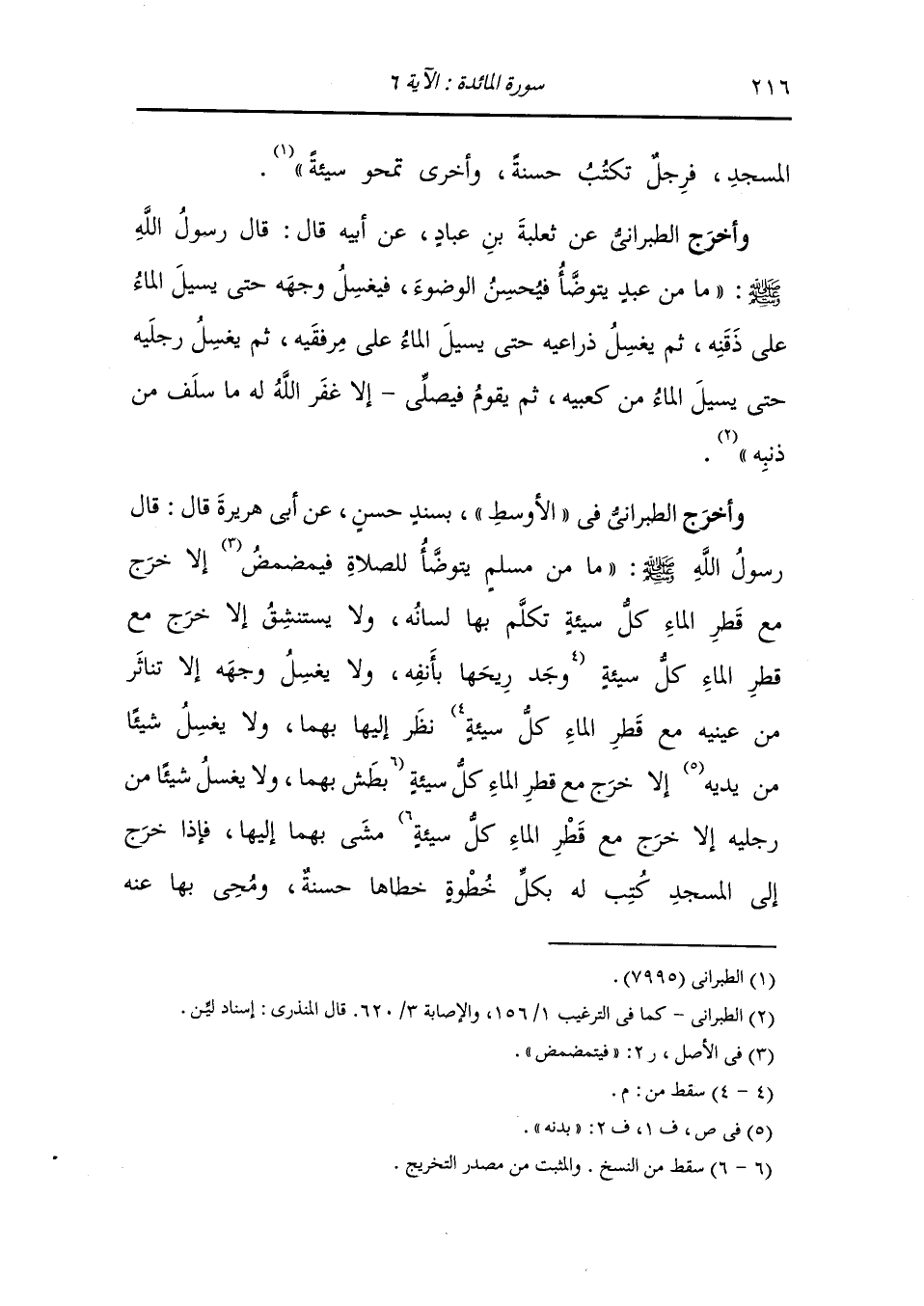 وأخرج الطبراني عن أبي أمامة ، أن النَّبِيّ صلى الله عليه وسلم قال ما من مسلم يتوضأ فيغسل يديه ويمضمض فاه ويتوضأ كما أمر الاحط عنه ماأصاب يومئذ مانطق به فمه وما مس بيديه وما مشى اليه حتى ان الخطايا لتتحادر من أطرافه ثم هو اذا مشى إلى