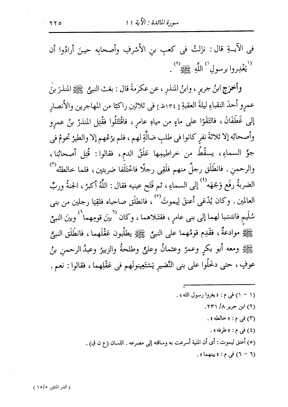 وأخرج ابن جرير عن يزيد بن زياد قال : جاء رسول الله صلى الله عليه وسلم بني النضير يستعينهم في عقل أصابه ومعه أبو بكر وعمر وعلي فقال أعينوني في عقل أصابني ، فقالوا : نعم يا أبا القاسم قد آن لك تأتينا وتسألنا حاجة اجلس حتى نطعمك ونعطيك الذي تسألنا فجلس رسول الله صلى الله عليه وسلم وأصحابه ينتظرونه وجاء حيي بن أخطب فقال حيي لأصحابه : لا ترونه أقرب منه الآن اطرحوا عليه حجارة فاقتلوه ولا ترون شرا أبدا فجاؤوا إلى رحى لهم عظيمة ليطرحوها عليه فامسك الله عنها أيديهم حتى جاءه جبريل فاقامه من بينهم فأنزل الله {يا أيها الذين آمنوا اذكروا نعمة الله عليكم إذ هم قوم} الآية ، فأخبر الله نبيه ما أرادوا.