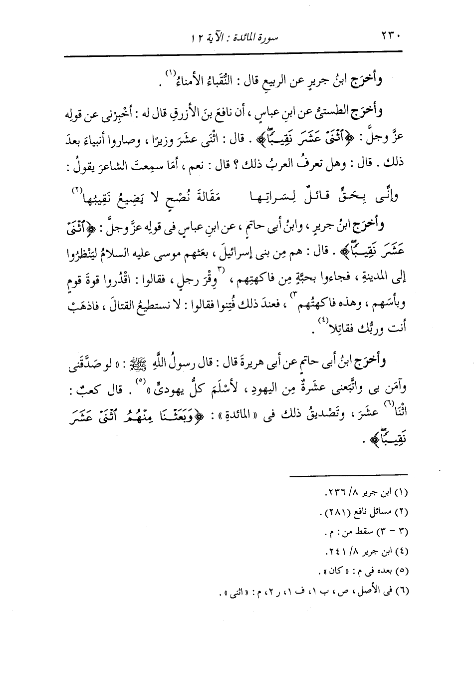 وأخرج عَبد بن حُمَيد ، وَابن جَرِير ، وَابن المنذر عن قتادة في قوله {وبعثنا منهم اثني عشر نقيبا} قال : شهيدا من كل سبط رجل شاهد على قومه