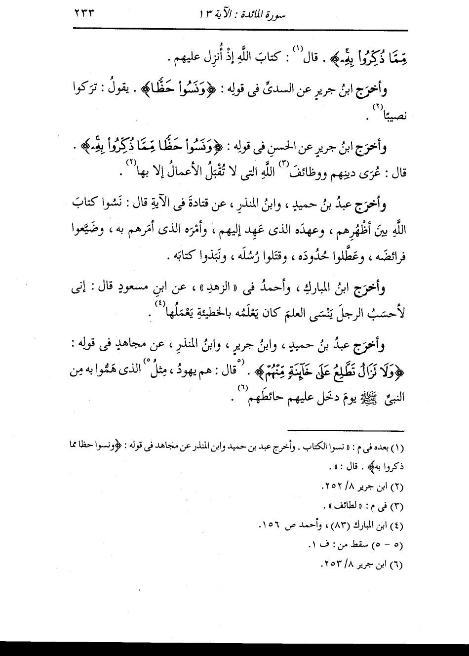 وأخرج ابن أبي حاتم عن ابن عباس في قوله {ونسوا حظا مما ذكروا به} قال : نسوا الكتاب.
