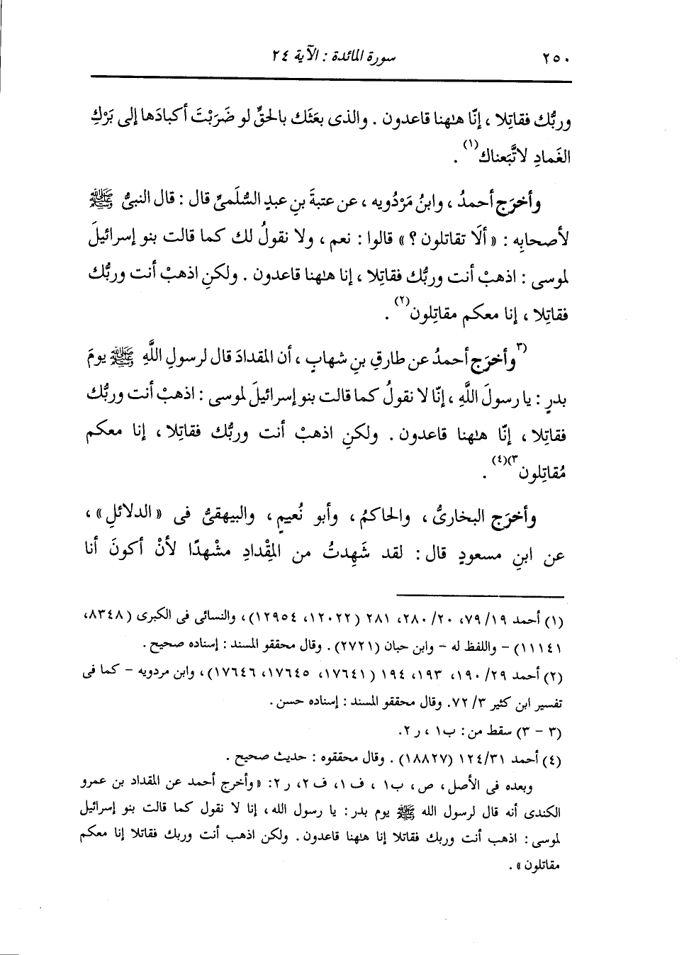 أَخْرَج أحمد والنسائي ، وَابن حبان عن انس أن رسول الله صلى الله عليه وسلم لما سار إلى بدر استشار المسلمين فأشار عليه عمر ثم استشارهم فقالت الأنصار : يامعشر الانصار إياكم يريد رسول الله صلى الله عليه وسلم ، قالوا : لا نقول كما قالت بنو اسرئيل لموسى {فاذهب أنت