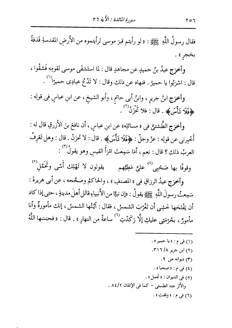 وأخرج عَبد بن حُمَيد عن الحسن قال : لما استسقى موسى لقومه أوحى الله اليه : أن اضرب بعصاك الحجر فانفجرت منه اثنتا عشرة عينا فقال لهم موسى : ردوا معشر الحمير ، فأوحى الله إليه : قلت لعبادي معشر الحمير واني قد حرمت عليكم الأرض المقدسة ، قال : يارب فاجعل قبري منها قذفة حجر