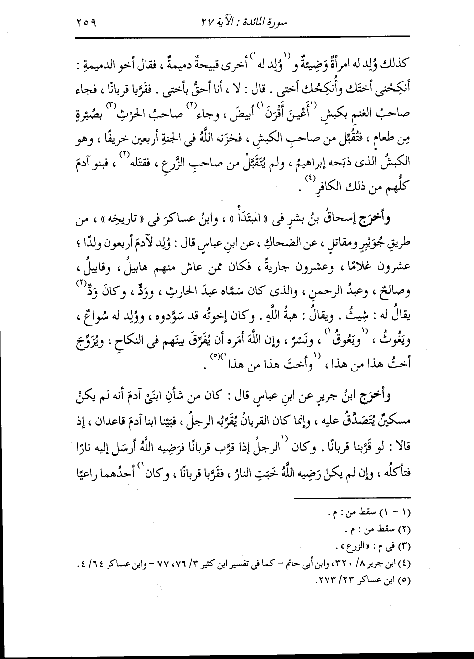 بالجارية وكان آدم قد غاب عنهما إلى مكة ينظر اليها فقال آدم للسماء : احفظي ولدي بالأمانة فأبت وقال للأرض فأبت وقال للجبال فأبت فقال لقابيل فقال : نعم تذهب وترجع وتجد أهلك كما يسرك ، فلما انطلق آدم قربا قربانا وكان قابيل يفخر عليه فقال : أنا أحق بها منك هي أختي وأنا أكبر منك وأنا وصي والدي فلما قربا قرب هابيل جذعة سمينة وقرب قابيل حزمة سنبل فوجد فيها سنبلة عظيمة ففركها فأكلها فنزلت النار فأكلت قربان هابيل وتركت قربان قابيل فغضب وقال : لأقتلنك حتى لا تنكح أختي ، فقال هابيل {إنما يتقبل الله من المتقين} {إني أريد أن تبوء بإثمي وإثمك} يقول : إثم قتلي إلى إثمك الذي في عنقك.