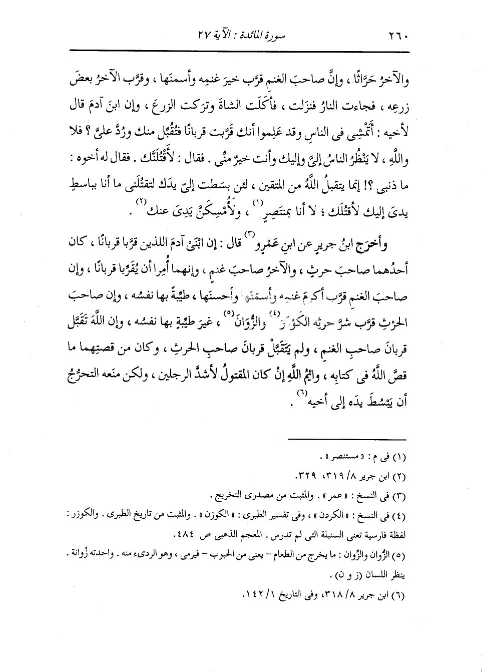 وأخرج ابن جرير عن ابن عباس قال : كان من شأن ابني آدم أنه لم يكن مسكين يتصدق عليه وانما كان القربان يقربه الرجل فبينا ابنا آدم قاعدان اذ قالا : لو قربنا قربانا وكان أحدهما راعيا
