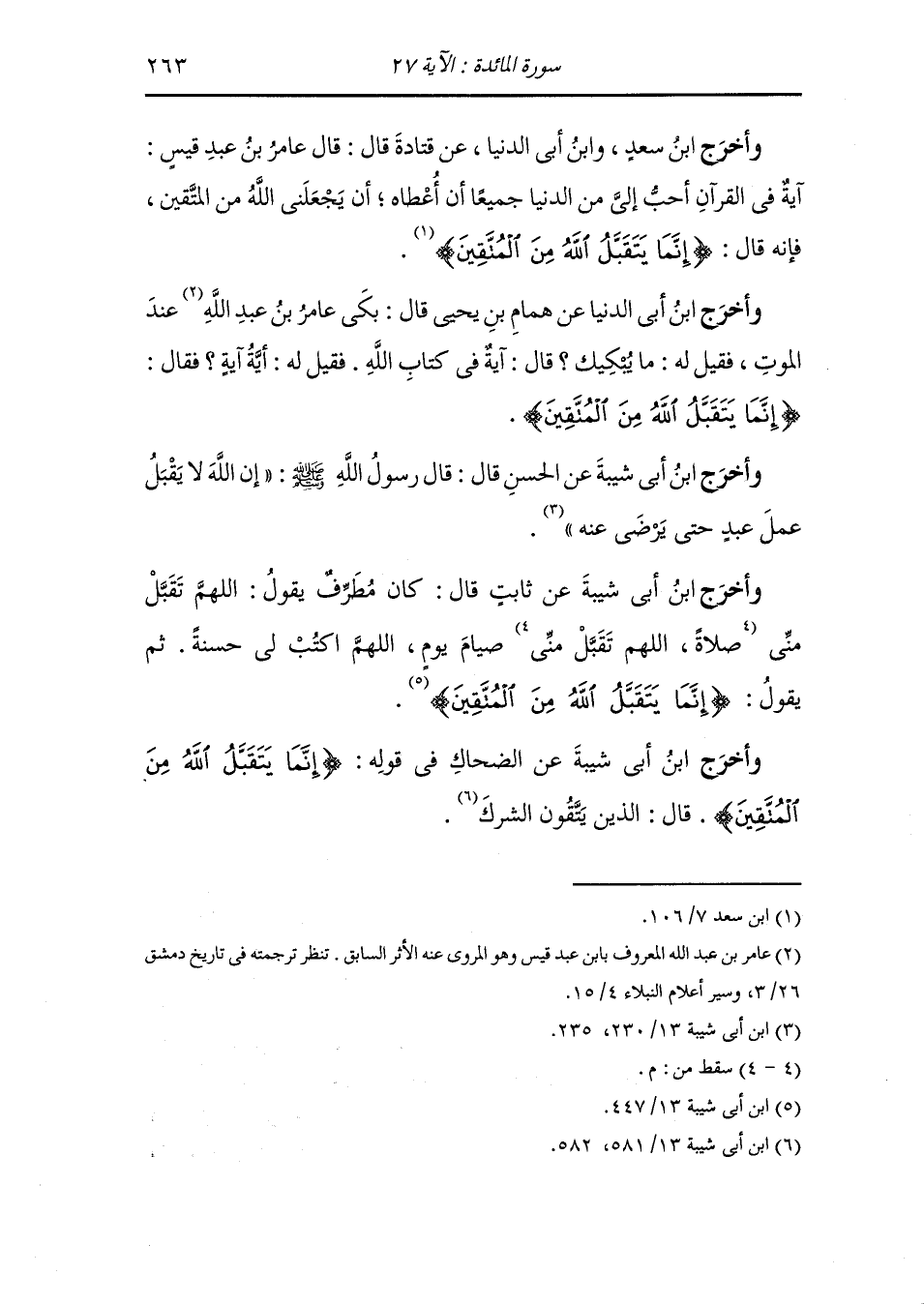 وأخرج ابن أبي الدنيا عن فضالة بن عبيد قال : لأن أكون اعلم ان الله يقبل مني مثقال حبة من خردل أحب إلي من الدنيا ومافيها فإن الله يقول {إنما يتقبل الله من المتقين}