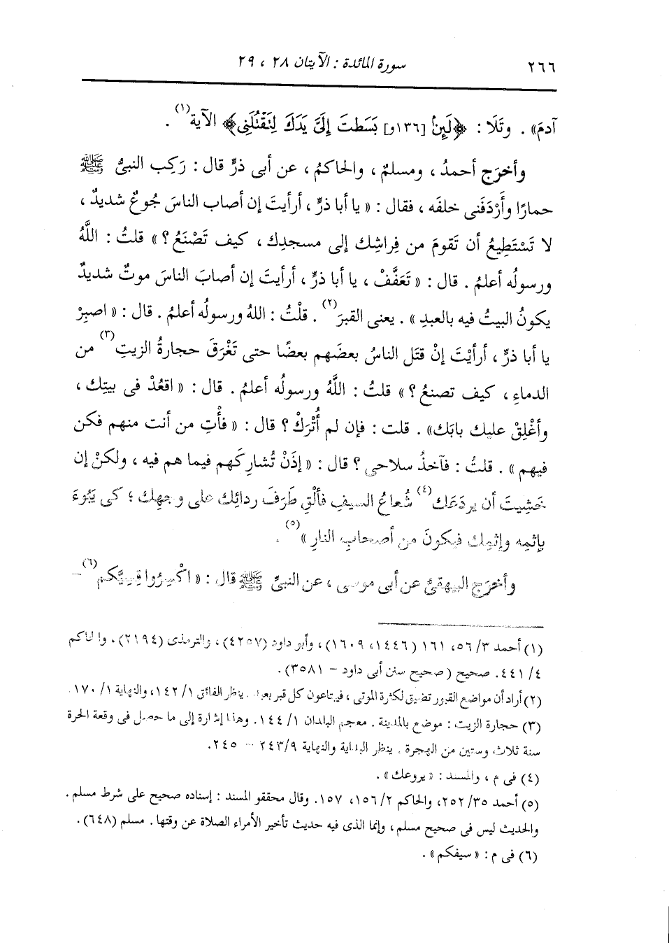 وَأخرَج أحمد وأبو داود والترمذي وحسنه والحاكم وصححه عن سعد بن أبي وقاص : أن رسول الله صلى الله عليه وسلم قال : انها ستكون فتنة القاعد فيها خير من القائم والقائم خير من الماشي والماشي خير من الساعي قال : أفرأيت ان دخل علي بيتي فبسط الي يده ليقتلني قال : كن كابن