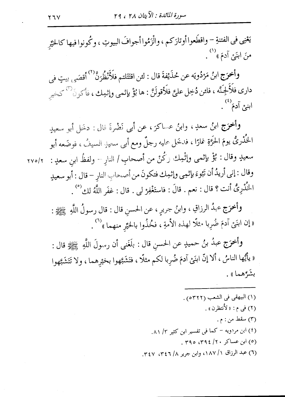 وأخرج أحمد ومسلم والحاكم عن أبي ذر قال ركب النَّبِيّ صلى الله عليه وسلم حمارا وأردفني خلفه فقال : يا أبا ذر أرأيت إن أصاب الناس جوع لاتستطيع أن تقوم من فراشك إلى مسجدك كيف تصنع قلت : الله ورسوله اعلم قال : تعفف يا أباذر أرأيت إن أصاب الناس موت شديد يكون البيت فيه بالعبد يعني القبر قلت : الله ورسوله أعلم قال : اصبر يا أبا ذر ، قال : أرأيت ان قتل الناس بعضهم بعضا حتى تغرق حجارة الزيت من الدماء كيف تصنع قلت : الله ورسوله أعلم قال : اقعد في بيتك واغلق بابك ، قلت : فان لم أترك قال : فائت من أنق منهم فكن فيهم ، قلت : فآخذ سلاحي قال : اذن تشاركهم فيما هم فيه ولكن ان خشيت أن يروعك شعاع السيف فالق طرف ردائك على وجهك حتى يبوء بإثمه وإثمك فيكون من أصحاب النار.
