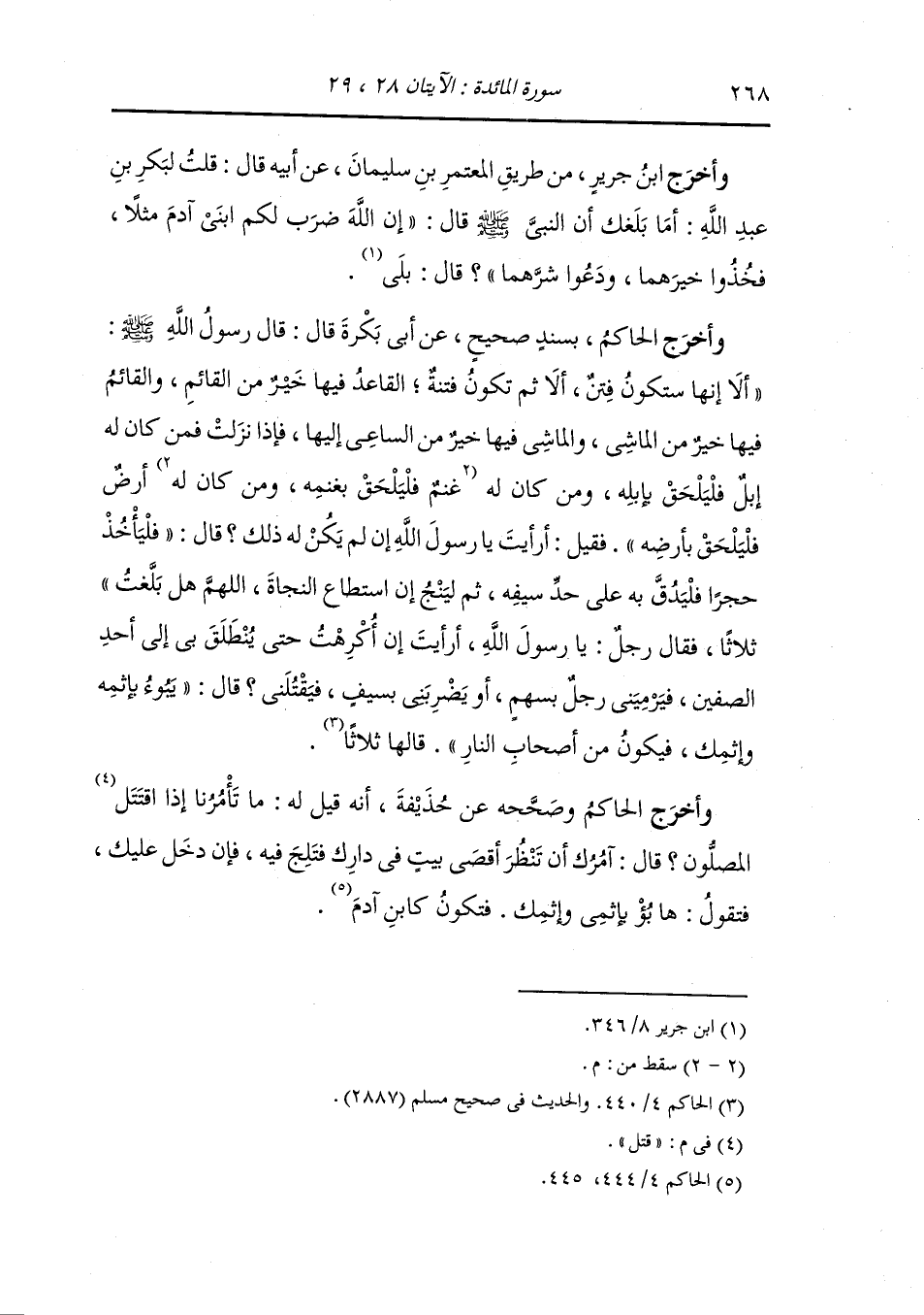 وأخرج ابن مردويه عن حذيفة قال : لئن اقتتلتم لانتظرن أقصى بيت في داري فلالجنه فلئن علي فلأقولن : ها بؤ بإثمي وإثمك كخير ابني آدم.