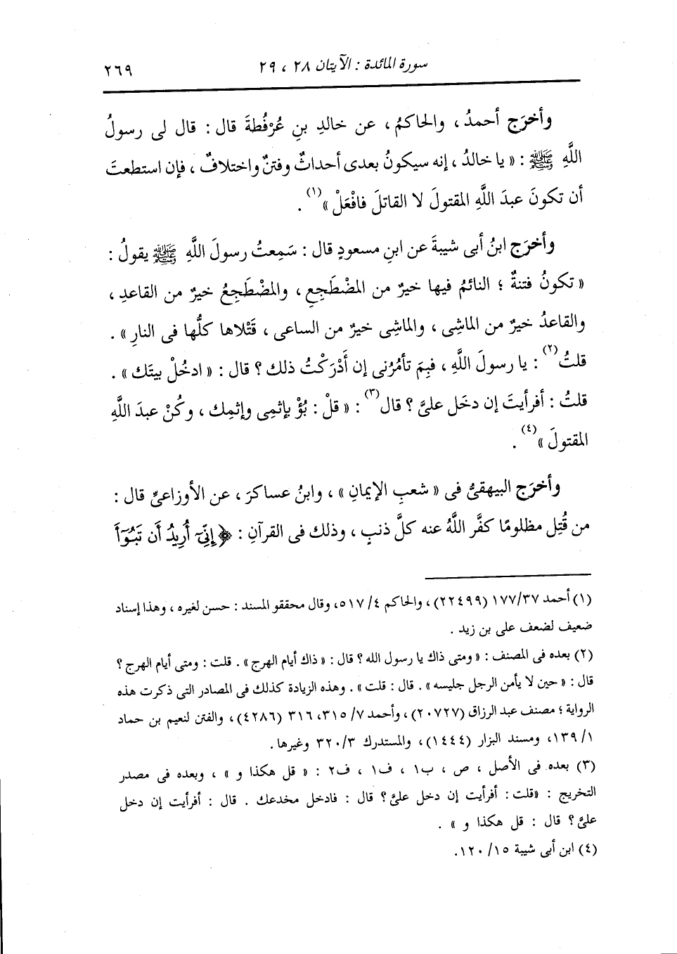 وأخرج الحاكم وصححه عن حذيفة أنه قيل له : ما تأمرنا اذا قتل المصلون قال : آمرك أن تنظر أقصى بيت في دارك فلتج فيه فان دخل عليك فتقول له : بؤ بإثمي وإثمك فتكون كابن آدم