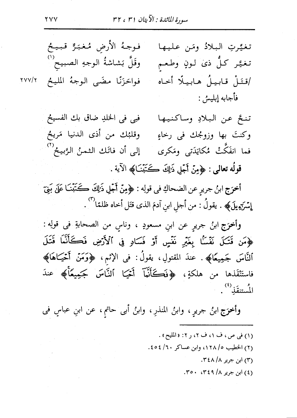 وأخرج ابن جرير عن علي بن أبي طالب رضي الله عنه قال : لما قتل ابن آدم بكى آدم فقال : تغيرت البلاد ومن عليها * فلون الأرض مغبر قبيح تغير كل ذي لون وطعم * وقل بشاشة الوجه المليح فاجيب آدم عليه السلام : أبا هابيل قد قتلا جميعا * وصار الحي بالميت الذبيح وجاء بشره قد كان منه * على خوف فجاء بها يصيح.