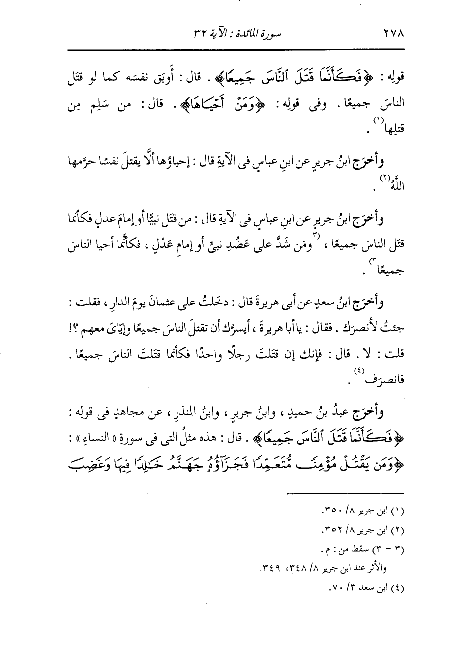 وأخرج ابن جرير عن ابن مسعود وناس من الصحابة في قوله {من قتل نفسا بغير نفس أو فساد في الأرض فكأنما قتل الناس جميعا} عند المقتول يقول : في الإثم {ومن أحياها} فاستنقذها من هلكة {فكأنما أحيا الناس جميعا} عند المستنفذ.