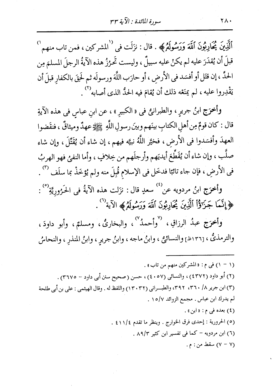 - قوله تعالى : إنما جزاء الذين يحاربون الله ورسوله ويسعون في الأرض فسادا أن يقتلوا أو يصلبوا أو تقطع أيديهم وأرجلهم من خلاف أو ينفوا من الأرض ذلك لهم خزي في الدنيا ولهم في الآخرة عذاب عظيم * إلا الذين تابوا من قبل أن تقدروا عليهم فاعلموا أن الله غفور رحيم.