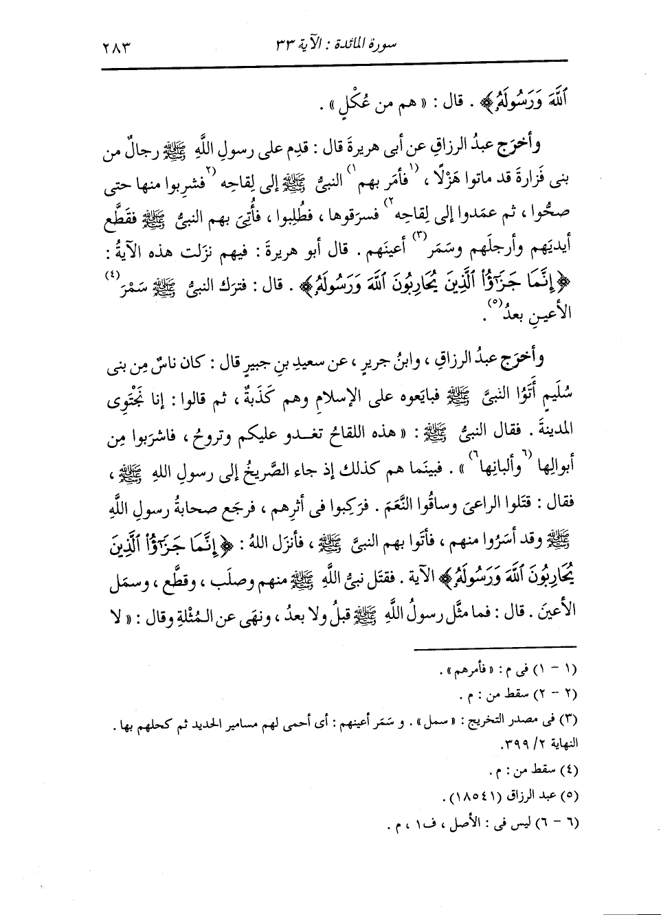 وأخرج ابن جرير عن يزيد بن ابي حبيب ان عبد الملك بن مروان كتب إلى انس يسأله عن هذه الآية فكتب اليه أنس يخبره ان هذه الآية نزلت في أولئك النفر من العرنين وهم من بجيلة ، قال أنس فارتدوا عن الإسلام وقتلوا الراعي واستاقوا الإبل وأخافوا السبيل وأصابوا الفرج الحرام فسأل رسول الله صلى الله عليه وسلم جبريل عن القضاء فيمن حارب فقال : من سرق وأخاف السبيل واستحل الفرج الحرام فاصلبه.