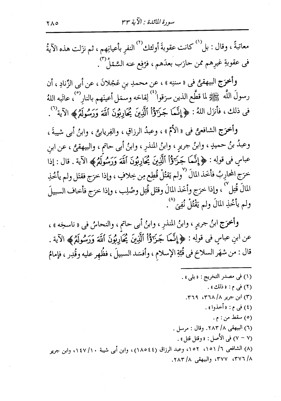 وأخرج ابن جرير عن السدي في قوله {إنما جزاء الذين يحاربون الله ورسوله} الآية ، قال : نزلت في سودان عرينة أتوا النَّبِيّ صلى الله عليه وسلم وبهم الماء الأصفر فشكوا ذلك إليه فأمرهم فخرجوا إلى إبل الصدقة فقال اشربوا من أبوالها وألبانها فشربوا حتى اذا صحوا وبرئوا قتلوا الرعاة واستاقوا الإبل فبعث رسول الله صلى الله عليه وسلم فأتى بهم فأراد ان يسمل اعينهم فنهاه الله عن ذلك وأمره أن يقيم فيهم الحدود كما انزل الله.