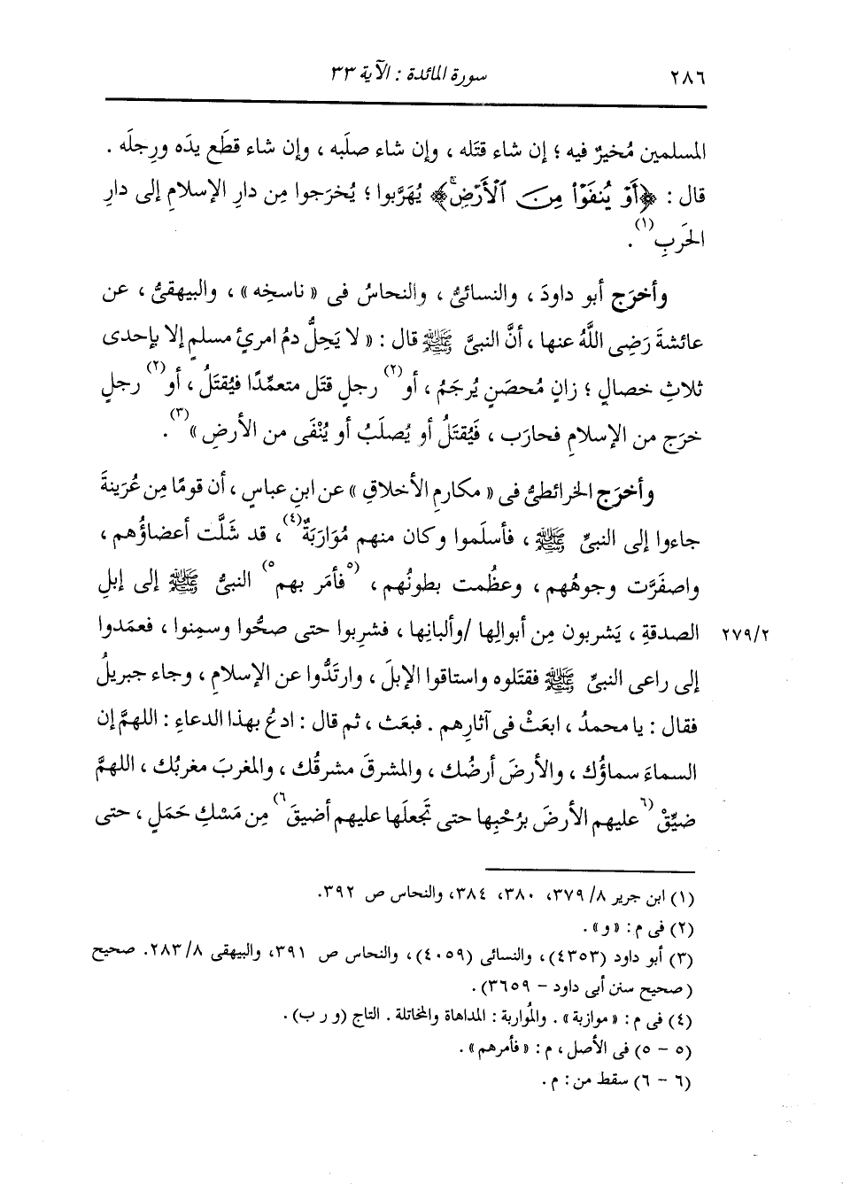 وأخرج ابن جرير ، وَابن المنذر ، وَابن أبي حاتم والنحاس في ناسخه عن ابن عباس في قوله {إنما جزاء الذين يحاربون الله ورسوله} الآية ، قال : من شهر السلاح في قبة الإسلام وأفسد السبيل وظهر عليه وقدر فإمام