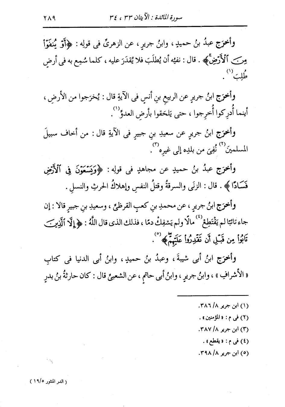 وأخرج عَبد بن حُمَيد ، وَابن جَرِير عن الضحاك فال كان قوم بينهم وبين النَّبِيّ صلى الله عليه وسلم ميثاق فنقضوا العهد وقطعو السبل وأفسدوا في الأرض فخير الله نبيه فيهم ان شاء قتل وان شاء صلب وان شاء قطع أيديهم وأرجلهم من خلاف أو ينفوا من الأرض ، قال : هو ان يطلبوا حتى يعجزوا فمن تاب قبل أن يقدروا عليه قبل ذلك منه.