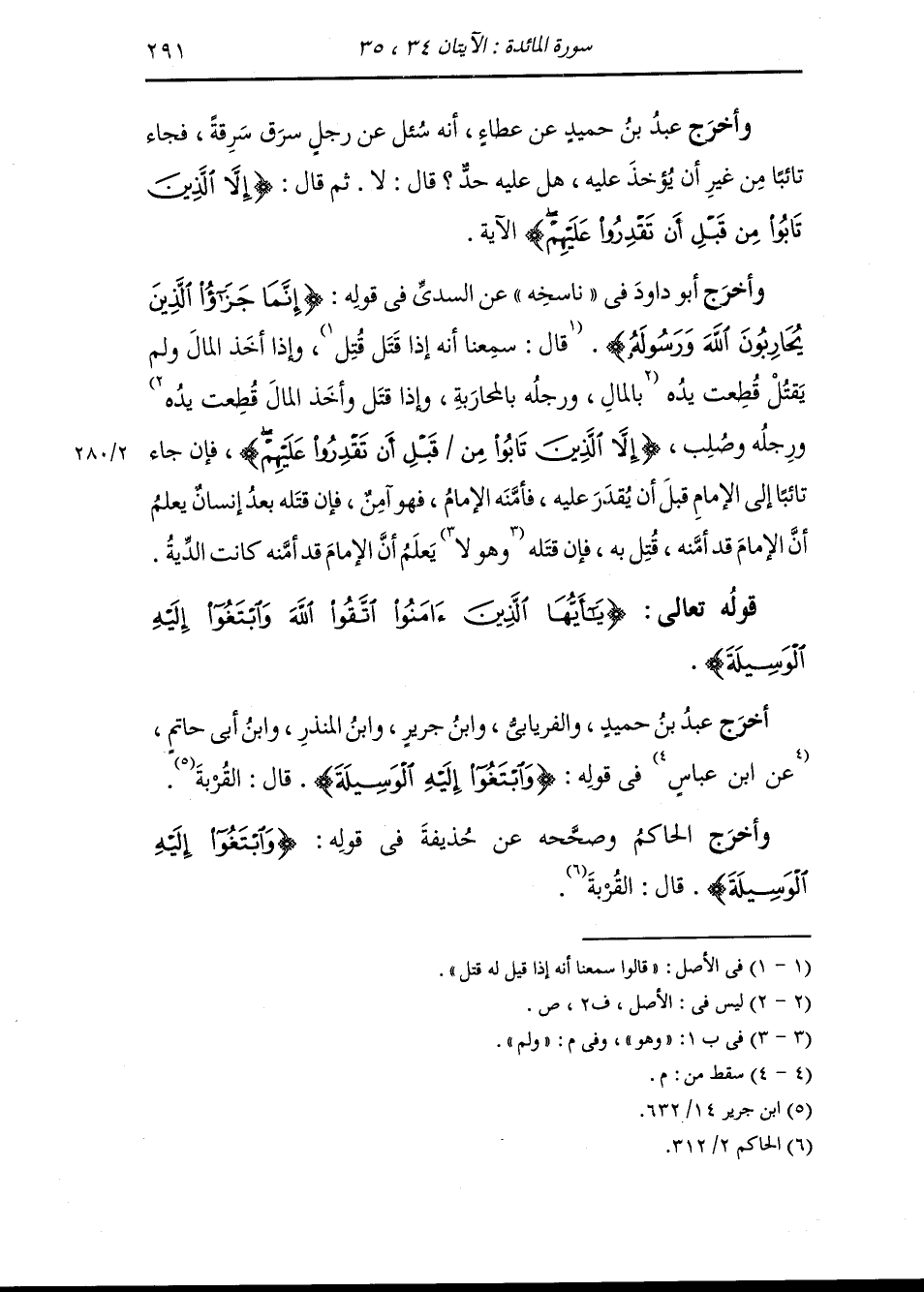 وأخرج ابن أبي شيبة ، وعَبد بن حُمَيد عن الاشعث عن رجل قال : صلى رجل مع أبي موسى الأشعري الغداة ثم قال : هذا مقام العائذ التائب أنا فلان بن فلان أنا كنت ممن حارب الله ورسوله وجئت تائبا من قبل أن يقدر علي فقال أبو موسى : ان فلان بن فلان كان ممن حارب الله ورسوله وجاء تائبا من قبل أن يقدر عليه فلايعرض له أحد إلا بخير فان يكن صادقا فسبيلي ذلك وان يك كاذبا فلعل الله ان يأخذه بذنبه