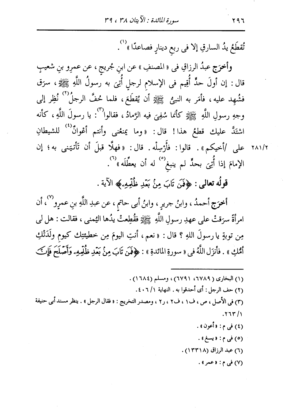 وأخرج سعيد بن منصور ، وَابن جَرِير ، وَابن المنذر وأبو الشيخ عن إبراهيم النخعي ، انه قال : في قراءتنا وربما قال : في قراءة عبد الله والسارقون والسارقات فاقطعوا أيمانهم.