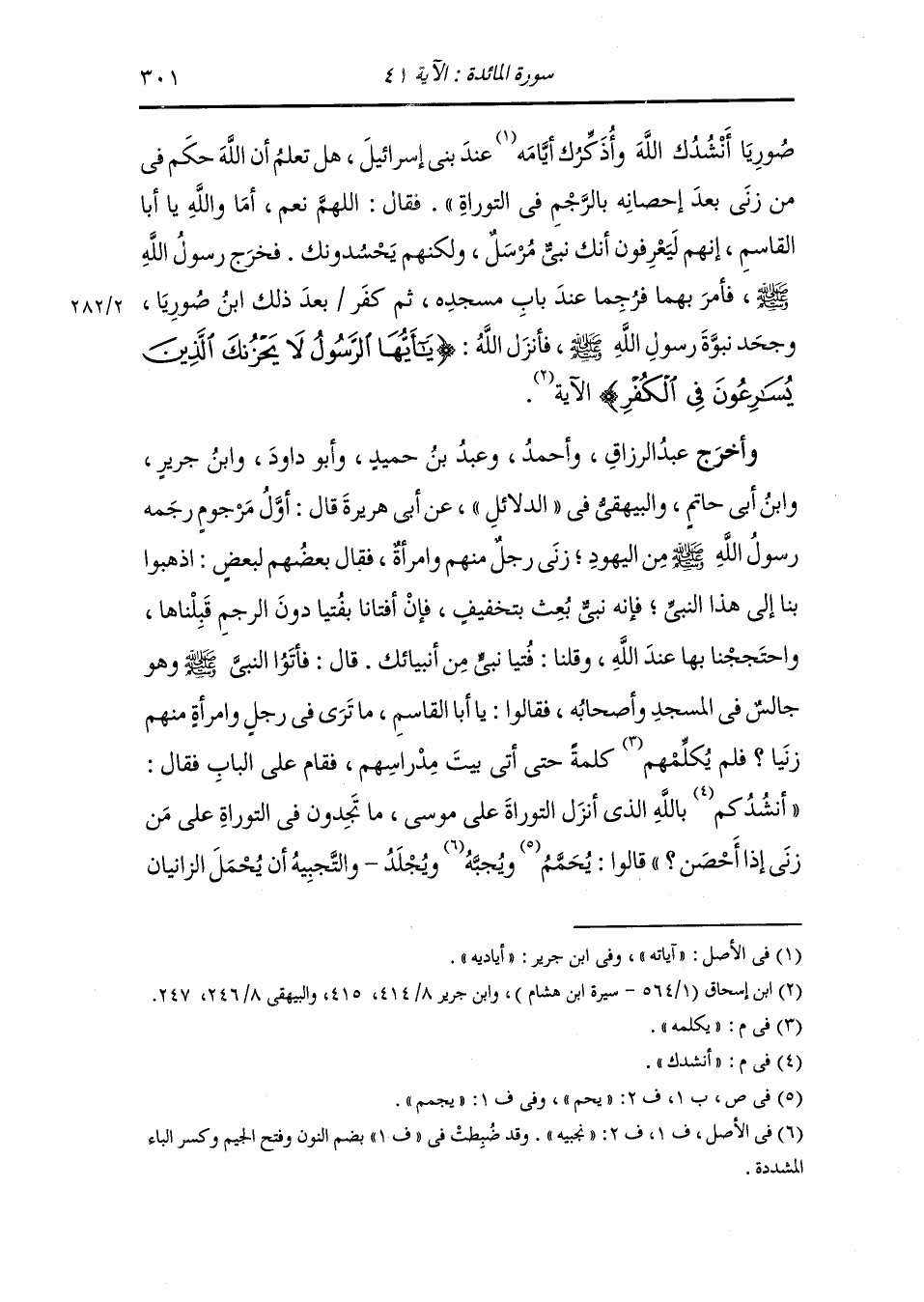 وأخرج ابن إسحاق ، وَابن جَرِير ، وَابن المنذر والبيهقي في "سُنَنِه" عن أبي هريرة ان أحبار اليهود اجتمعوا في بيت المدراس حين قدم رسول الله صلى الله عليه وسلم المدينة وقد زنى رجل بعد احصانه بامرأة من اليهود وقد أحصنت فقالوا : ابعثوا هذا الرجل وهذه المرأة إلى محمد فاسألوه كيف الحكم فيهما وولوه الحكم فيهما فان حكم بعملكم من التجبية والجلد بحبل من ليف مطلي بقار ثم يسود وجوههما ثم يحملان على حمارين وجوههما من قبل أدبار الحمار فاتبعوه فانما هو ملك سيد القوم وان حكم فيهما بالنفي فانه نبي فاحذروه على ما في أيديكم أن يسلبكم ، فأتوه فقالوا : يامحمد ، هذا رجل قد زنى بعد إحصانه بامرأة قد أحصنت فاحكم فيهما فقد وليناك الحكم فيهما فمشى رسول الله صلى الله عليه وسلم حتى أتى أحبارهم في بيت