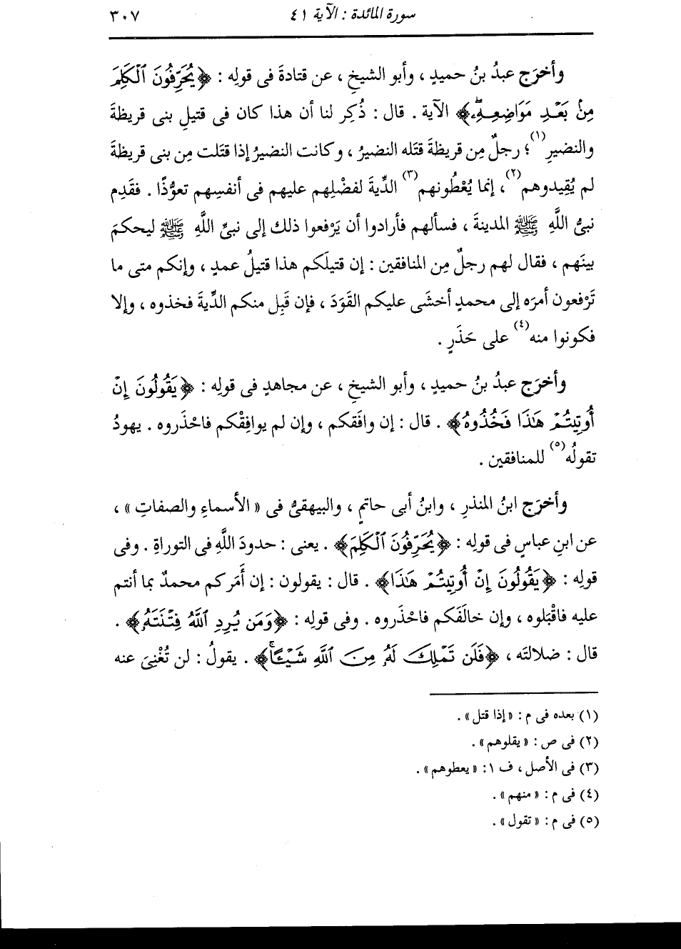 وأخرج أبو الشيخ عن إبراهيم النخعي في قوله {يحرفون الكلم عن مواضعه} (المائدة الآية 13) قال : كان يقول بني اسرائيل : يابني أحباري فحرفوا ذلك فجعلوه يابني أبكاري فذلك قوله {يحرفون الكلم عن مواضعه} وكان إبراهيم يقرأها (يحرفون الكلم من مواضعه)