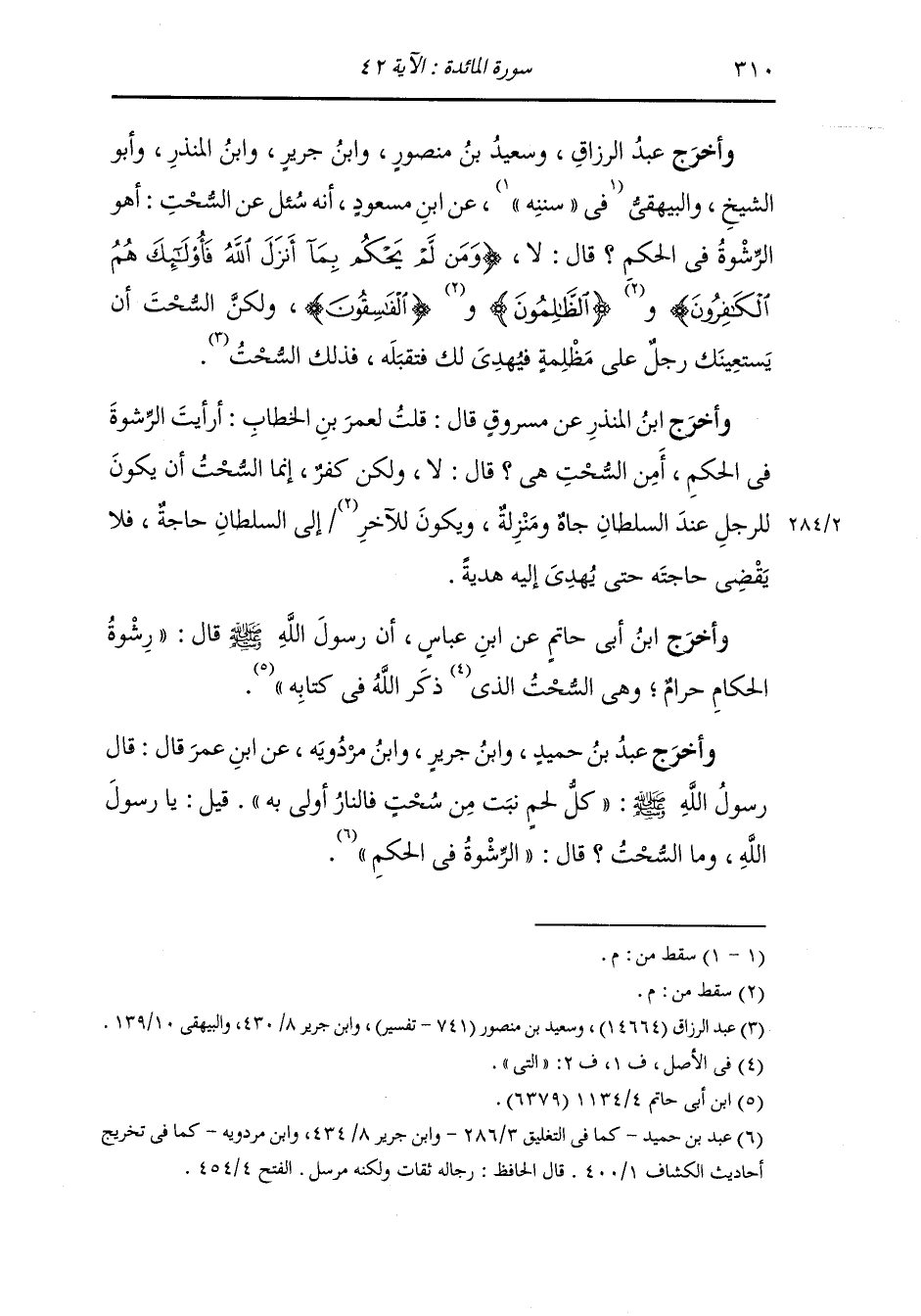 وأخرج عَبد بن حُمَيد ، وَابن جَرِير ، وَابن المنذر والطبراني والبيهقي في "سُنَنِه" عن ابن عباس أنه سئل عن السحت فقال : الرشا ، قيل : في الحكم قال : ذلك الكفر ثم قرأ {ومن لم يحكم بما أنزل الله فأولئك هم الكافرون} المائدة الآية 44