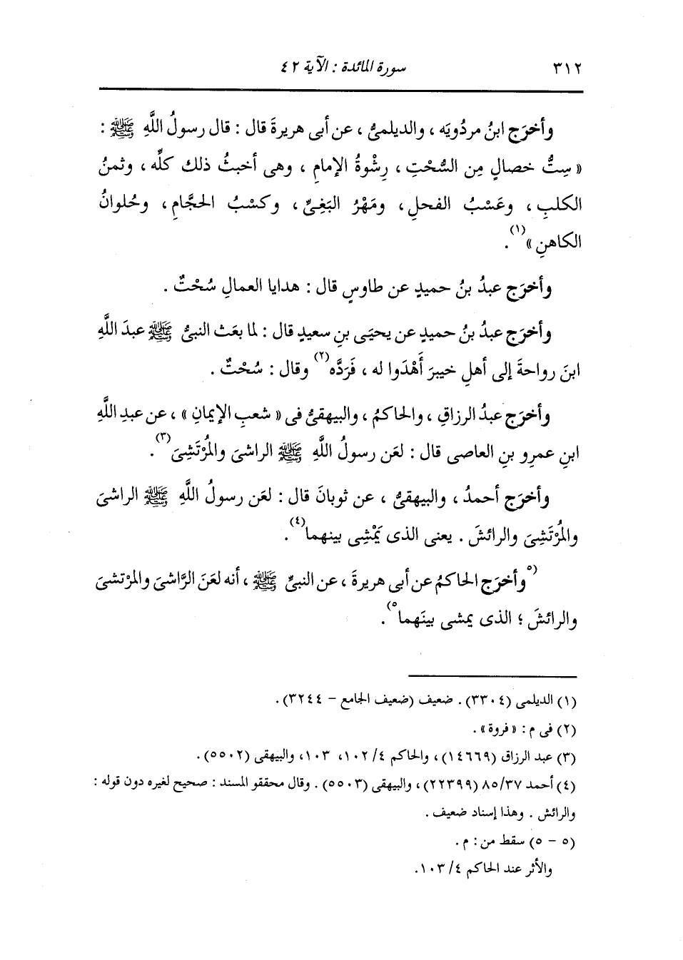 وأخرج عَبد بن حُمَيد عن علي بن أبي طالب ، انه سئل عن السحت فقال : الرشا ، فقيل له : في الحكم قال : ذاك الكفر.