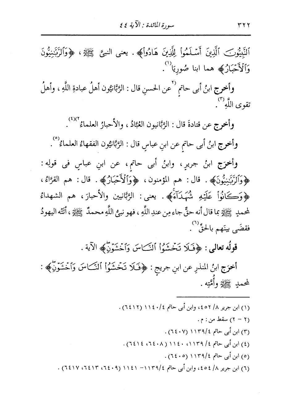 وأخرج عن قتادة قال {الربانيون} فقهاء اليهود {والأحبار} العلماء.