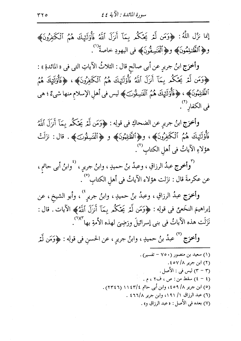 وأخرج سعيد بن منصور والفريابي ، وَابن المنذر ، وَابن أبي حاتم والحاكم وصححه والبيهقي في "سُنَنِه" عن ابن عباس في قوله {ومن لم يحكم بما أنزل الله فأولئك هم الكافرون} {ومن لم يحكم بما أنزل الله فأولئك هم الظالمون} (المائدة آية 45) {ومن لم يحكم بما أنزل الله فأولئك هم الفاسقون} (المائدة آية 47) قال : كفر دون كفر وظلم دون ظلم وفسق دون فسق.