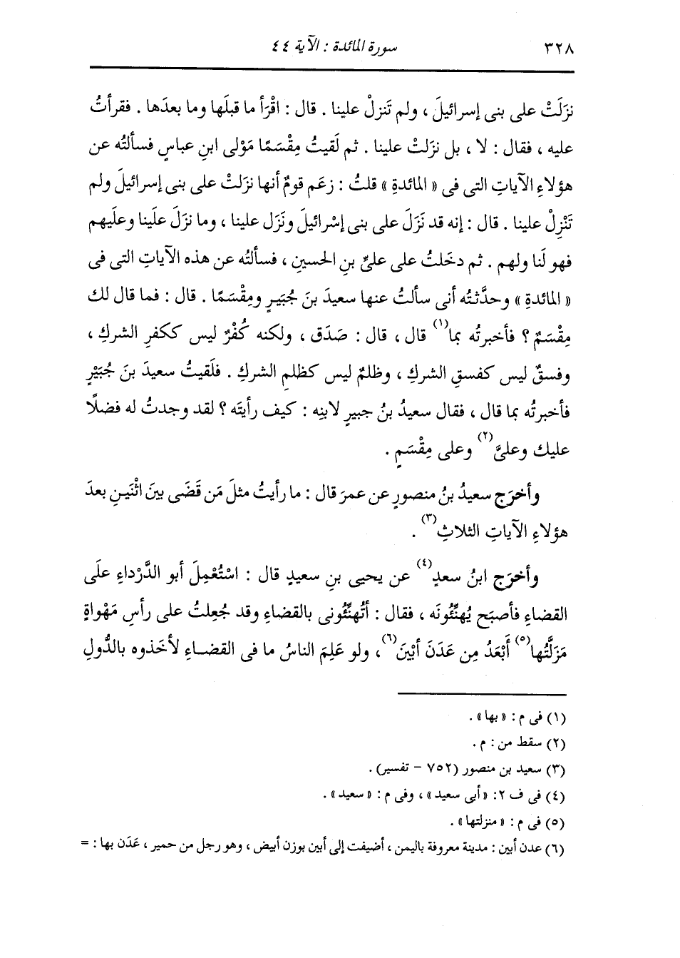 وأخرج عَبد بن حُمَيد عن حكيم بن جبير قال : سألت سعيد بن جبير عن هذه الآيات في المائدة {ومن لم يحكم بما أنزل الله فأولئك هم الكافرون} {ومن لم يحكم بما أنزل الله فأولئك هم الظالمون} {ومن لم يحكم بما أنزل الله فأولئك هم الفاسقون} فقلت : زعم قوم أنها