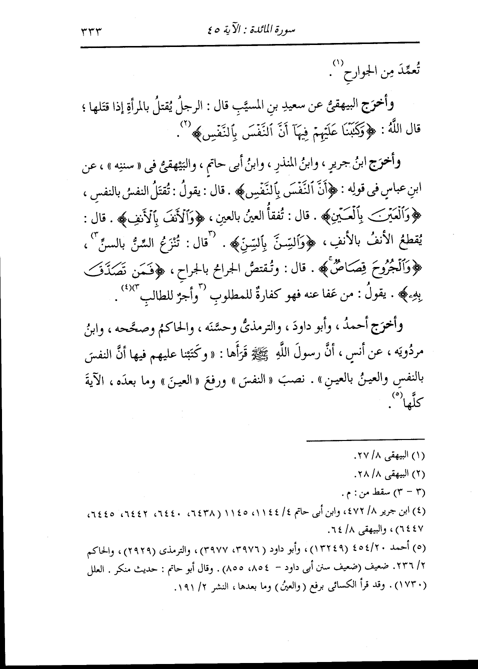 وأخرج عَبد بن حُمَيد وأبو الشيخ عن قتادة {وكتبنا عليهم فيها} قال : في التوراة {أن النفس بالنفس} الآية ، قال : إنما انزل ما تسمعون في أهل الكتاب حين نبذوا كتاب الله وعطلوا حدوده وتركوا كتابه وقتلوا رسله.