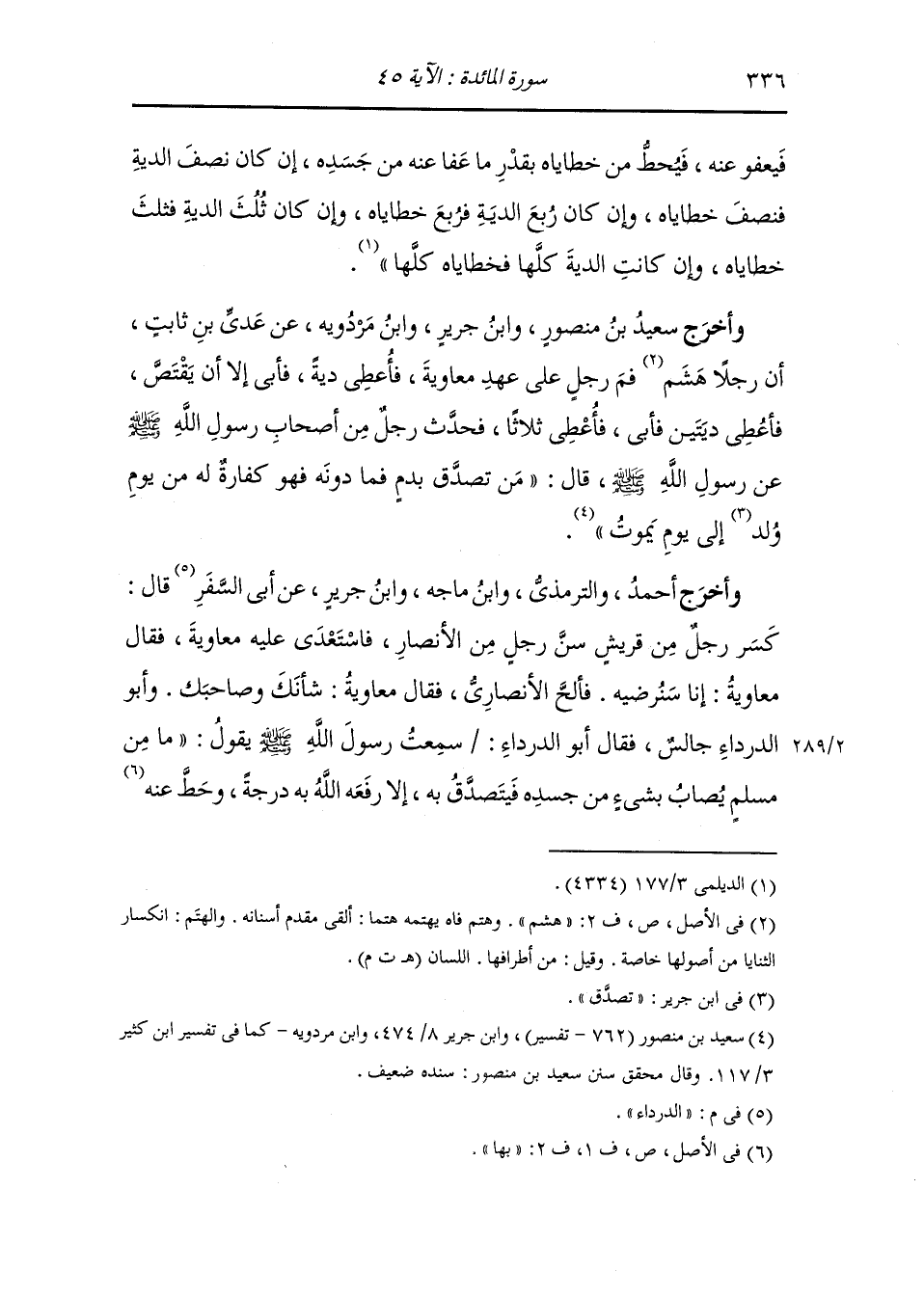 وأخرج ابن مردويه عن رجل من الأنصار عن النَّبِيّ صلى الله عليه وسلم في قوله {فمن تصدق به فهو كفارة له} قال : الرجل تكسر سنه أو تقطع يده أو يقطع الشيء أو يجرح في بدنه فيعفو عن ذلك فيحط عنه قدر خطاياه فان كان ربع الدية فربع خطاياه وان كان الثلث فثلث خطاياه وان كانت الدية حطت عنه خطاياه كذلك.