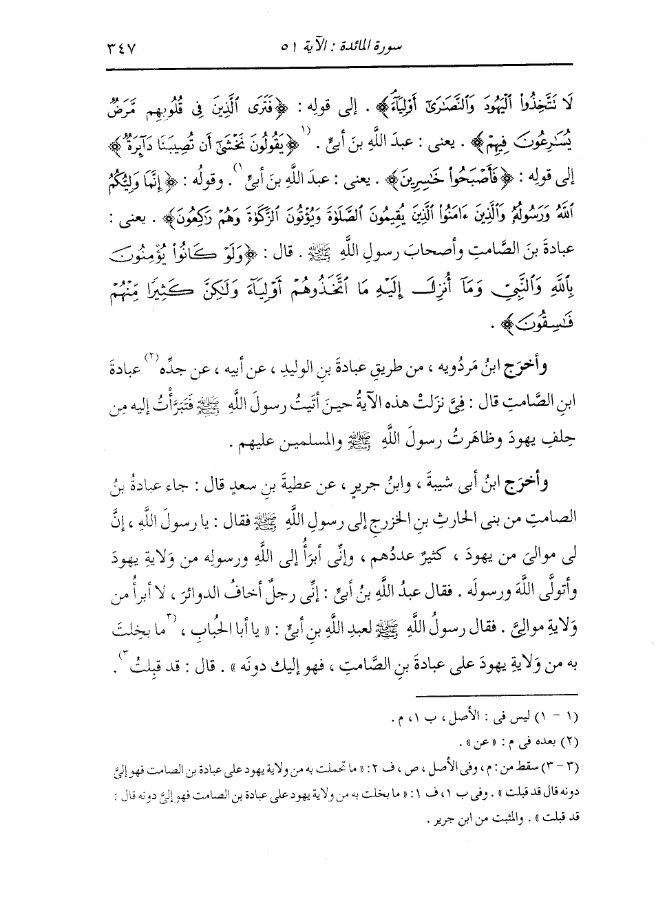 أَخْرَج ابن إسحاق ، وَابن جَرِير ، وَابن المنذر ، وَابن أبي حاتم وأبو الشيخ ، وَابن مردويه والبيهقي في الدلائل ، وَابن عساكر عن عبادة بن الوليد ان عبادة بن الصامت قال : لما حاربت بنو قينقاع رسول الله صلى الله عليه وسلم تشبث بأمرهم عبد الله بن سلول وقام دونهم ومشى عبادة بن الصامت إلى رسول الله صلى الله عليه وسلم وتبرأ إلى الله والى رسوله من حلفهم - وكان أحد بني عوف بن الخزرج - وله من حلفهم مثل الذي كان لهم من عبد الله بن أبي فخلعهم إلى رسول الله صلى الله عليه وسلم وقال : أتولى الله ورسوله والمؤمنين وأبرأ إلى الله ورسوله من حلف هؤلاء الكفار وولايتهم وفيه وفي عبد الله بن أبي نزلت الآيات في المائدة {يا أيها الذين آمنوا لا تتخذوا اليهود والنصارى أولياء بعضهم أولياء بعض} إلى قوله {فإن حزب الله هم الغالبون}.